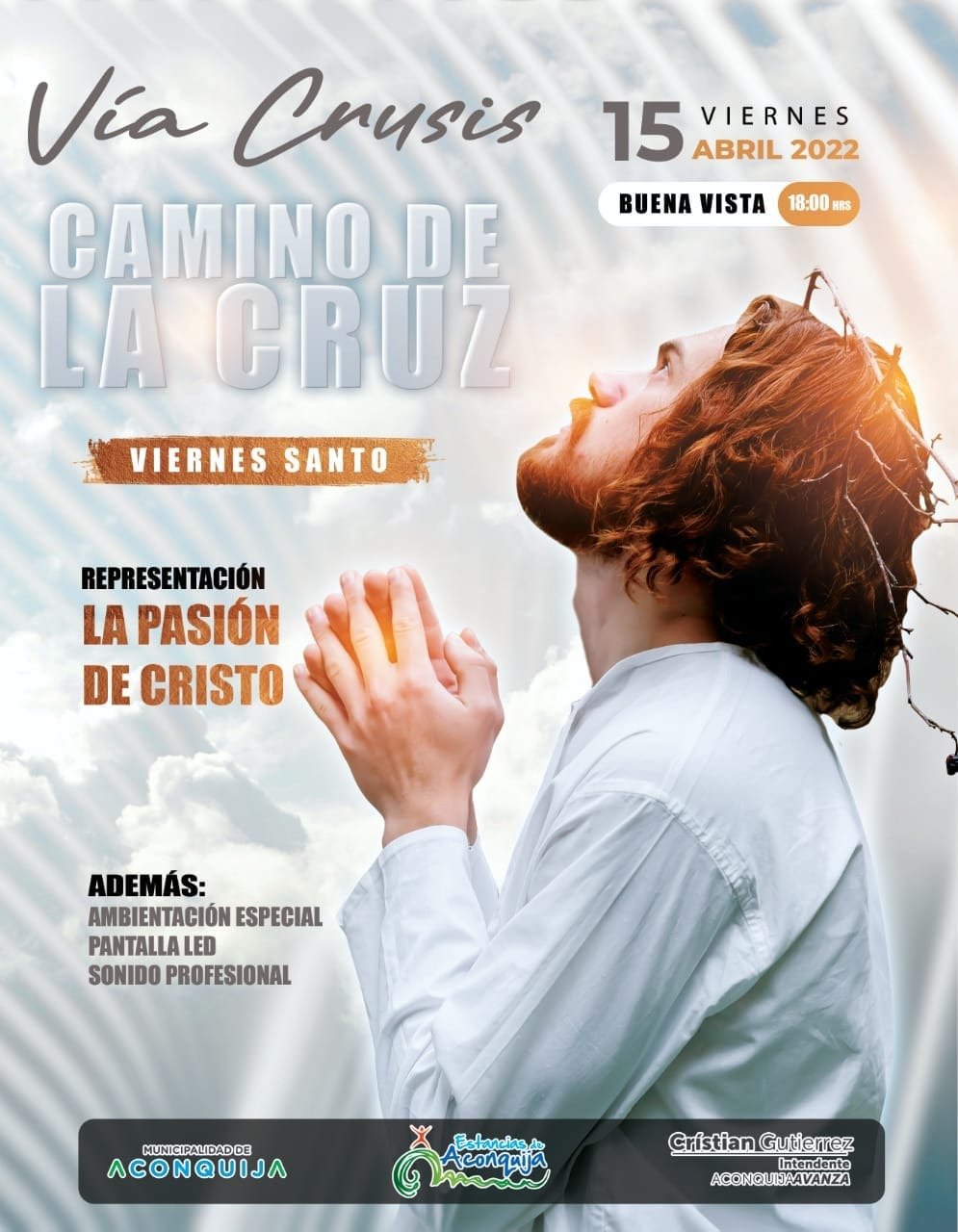 La gente va a poder disfrutar de un espectáculo de música clásica por una hora al aire libre y en la segunda parte se va a disfrutar de la puesta en escena de la Pasión de Cristo” el evento es libre y gratuito, siendo una propuesta interesante de la municipalidad de Aconquija para este viernes santo.