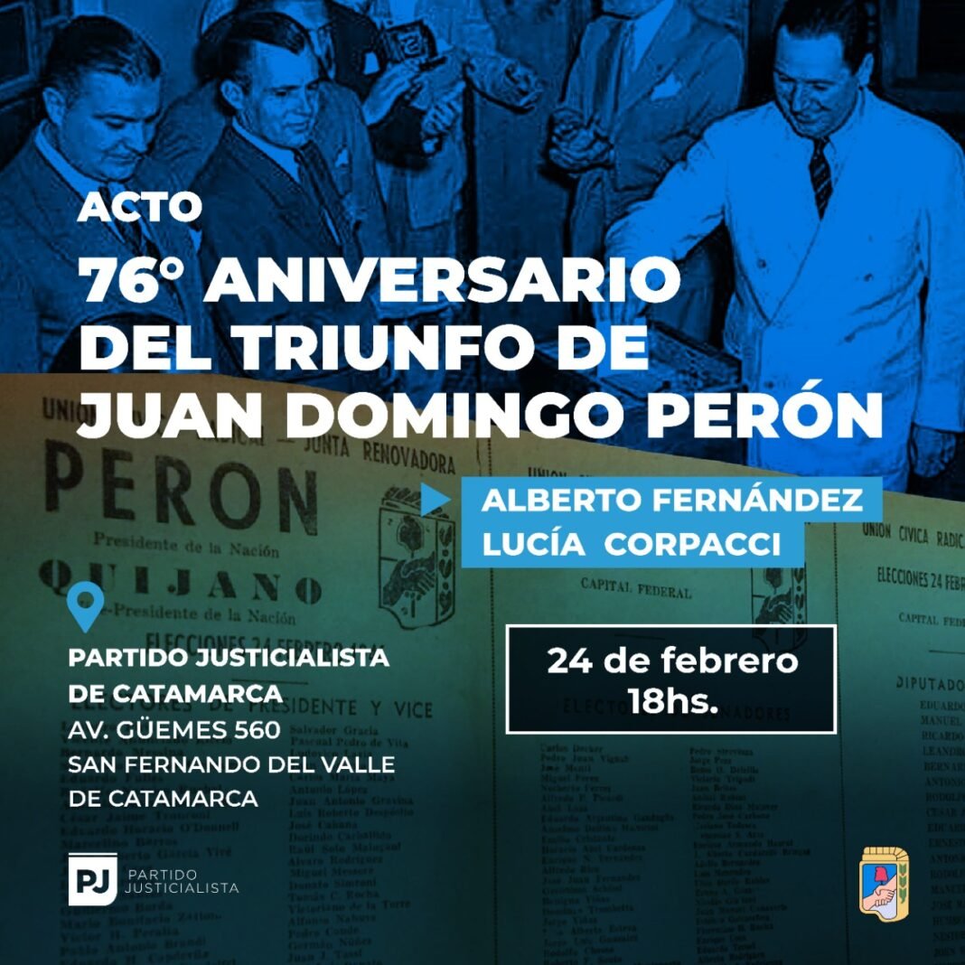 Con la presencia del Presidente del PJ Nacional Alberto Fernández y la Vicepresidenta Lucia Corpacci, este jueves 24 de febrero a las 18:00hs en la sede del Partido Justicialista de la provincia de Catamarca, se recordará la gesta patriótica que significó la llegada de Perón a la Presidencia de la Nación.