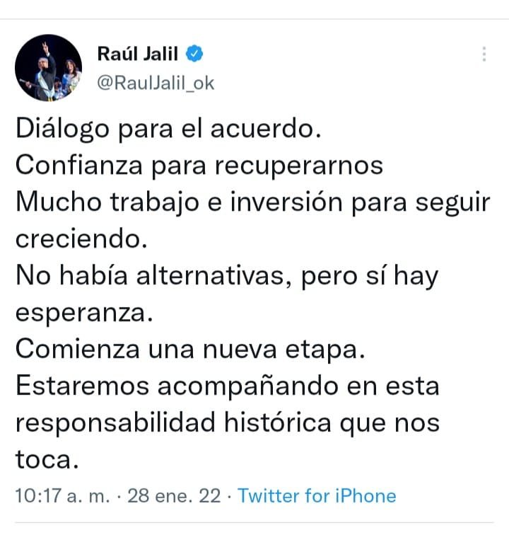 En un tuit, Jalil dijo: «Diálogo para el acuerdo. Confianza para recuperarnos. Mucho trabajo e inversión para seguir creciendo. No había alternativas, pero sí hay esperanza. Comienza una nueva etapa. Estaremos acompañando en esta responsabilidad histórica que nos toca».