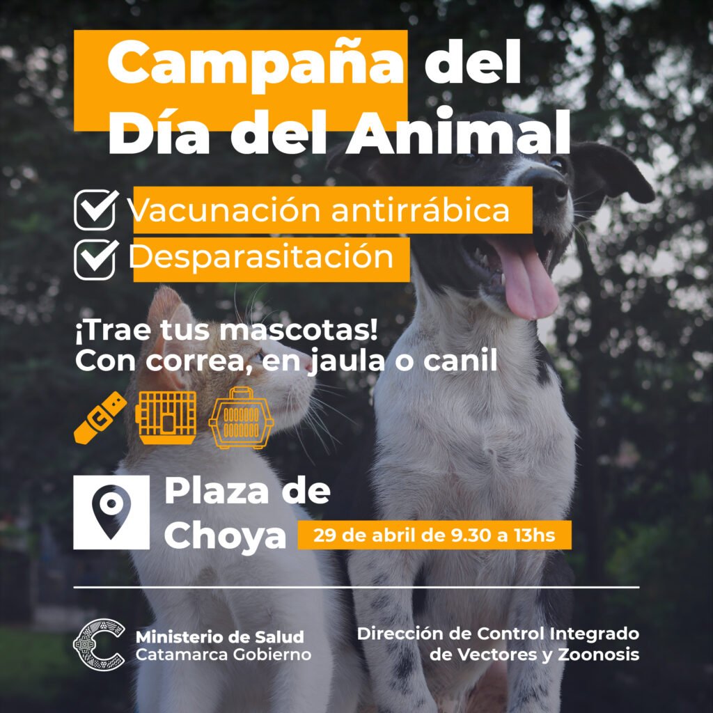 Con motivo de celebrarse el “Día del Animal”, el día viernes 29 de abril la Dirección de Control Integrado de Vectores y Zoonosis realizará vacunación antirrábica y desparasitación de caninos y felinos en la Plaza de Choya (Juan Pablo II) de 9.30 a 13 horas.