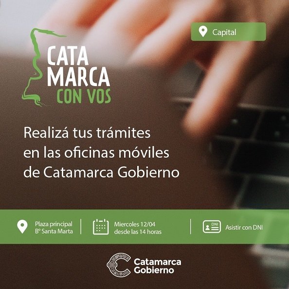 El programa provincial que acerca los trámites y servicios a todos los catamarqueños llega al Barrio Santa Marta. A través de móviles ubicados en puntos estratégicos, “Catamarca con Vos” en conjunto con “Municipio en tu Barrio”, estará presente este miércoles 12 de abril, de 14 a 18 en la plaza principal del barrio, ubicado al sur de la Capital.