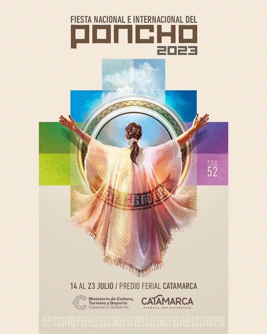 La edición número 52 de la Fiesta Nacional e Internacional del Poncho, que se realizará del 14 al 23 de julio en el Predio Ferial Catamarca, ya tiene su imagen oficial realizada por el artista visual catamarqueño Fabián Martinena, con la chacana- símbolo milenario de nuestros pueblos originarios-, como ojo de guitarra, junto a la mujer artesana.