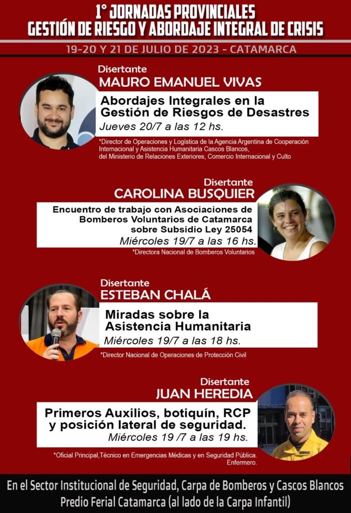El jueves al mediodía, Mauro Vivas, actual Director de Operaciones y Logística de la Agencia Argentina de Cooperación Internacional y Asistencia Humanitaria Cascos Blancos disertará sobre «Abordajes Integrales en la Gestión de Riesgos de Desastres». También se dictarán talleres gratuitos, abiertos al público en general, sobre cómo realizar maniobras de RCP (Reanimación Cardio Pulmonar), de Heimlinch y socorrismo.