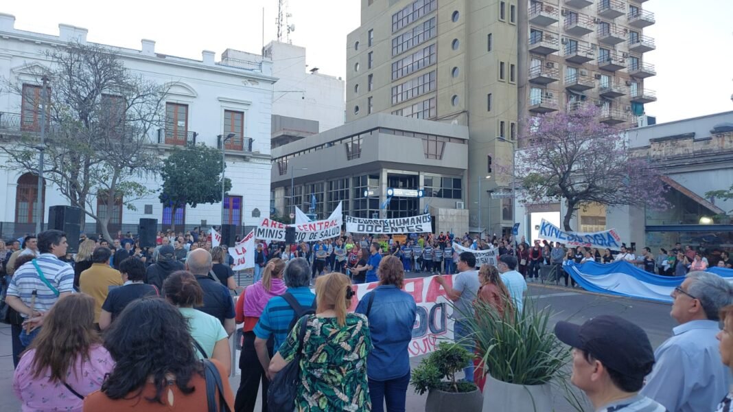 En efecto, la marcha partió desde plaza 25 de mayo recorriendo calles San Martín, Salta y República, hasta llegar nuevamente a la explanada frente al edificio de la ex Casa de Gobierno, donde los referentes de los gremios manifestaron su malestar por los últimos acuerdos salariales realizados por el Gobierno Provincial con los denominados “gremios afines”, los cuales van en detrimento del poder adquisitivo de los empleados públicos.