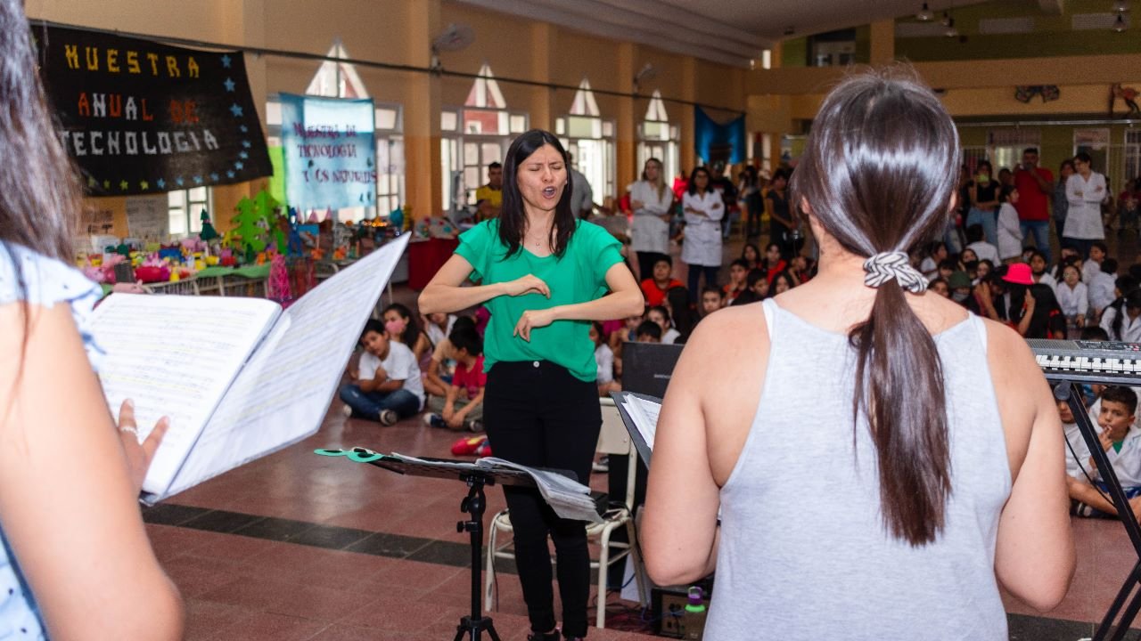 «Se trabajó anteriormente para que los chicos participaran con el coro, llevado adelante por el profe de música de la escuela que es parte del coro. Hicimos una obra hablada con los niños y también participaron acompañando con percusión un carnavalito», explicó la directora del Coro Polifónico de la Provincia, Vanina Aredes.