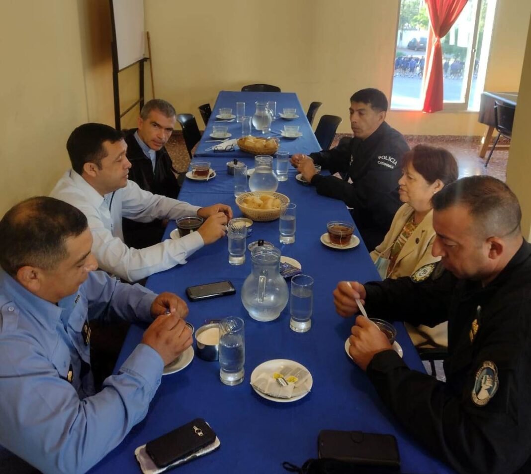 Durante la mañana de este jueves 21 de abril, en las instalaciones de la Escuela de Cadetes de la Policía de la Provincia, se realizó un desayuno de trabajo con la participación de la presidenta de la Liga de Madres, señora Isabel Esperanza González Ramírez; el capellán presbítero Héctor Salas; el director del IES policial, licenciado Omar Seiler; el director de la Escuela de Cadetes, comisario mayor Walter Quiroga; el director de la Escuela Superior, comisario Armando Humana; el director de la Escuela de Sub Oficiales y Aspirantes Agentes, comisario inspector Pedro Cáceres.