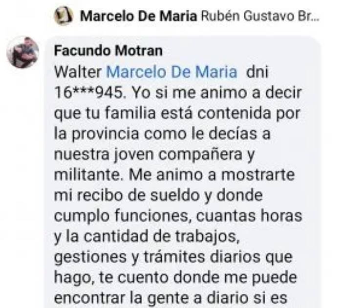 En el marco de la discusión, Motrán le respondió en otro posteo en el que le publica el DNI de Marcelo De María y le advierte que con un solo clik puede publicar la información de sus hijos. » Ya que estoy te muestro las dependencias y liquidaciones de índices provinciales de tus dos hijos y vos me contás dónde trabajan, cuál es la actividad pública que cumplen y si tenés ganas de humillarte más contáme de dónde son tus ingresos y tus funciones. No jodas Marcelo (…) acá vos sos sanguijuela y me toma un minuto y dos clics demostrártelo», advirtió.