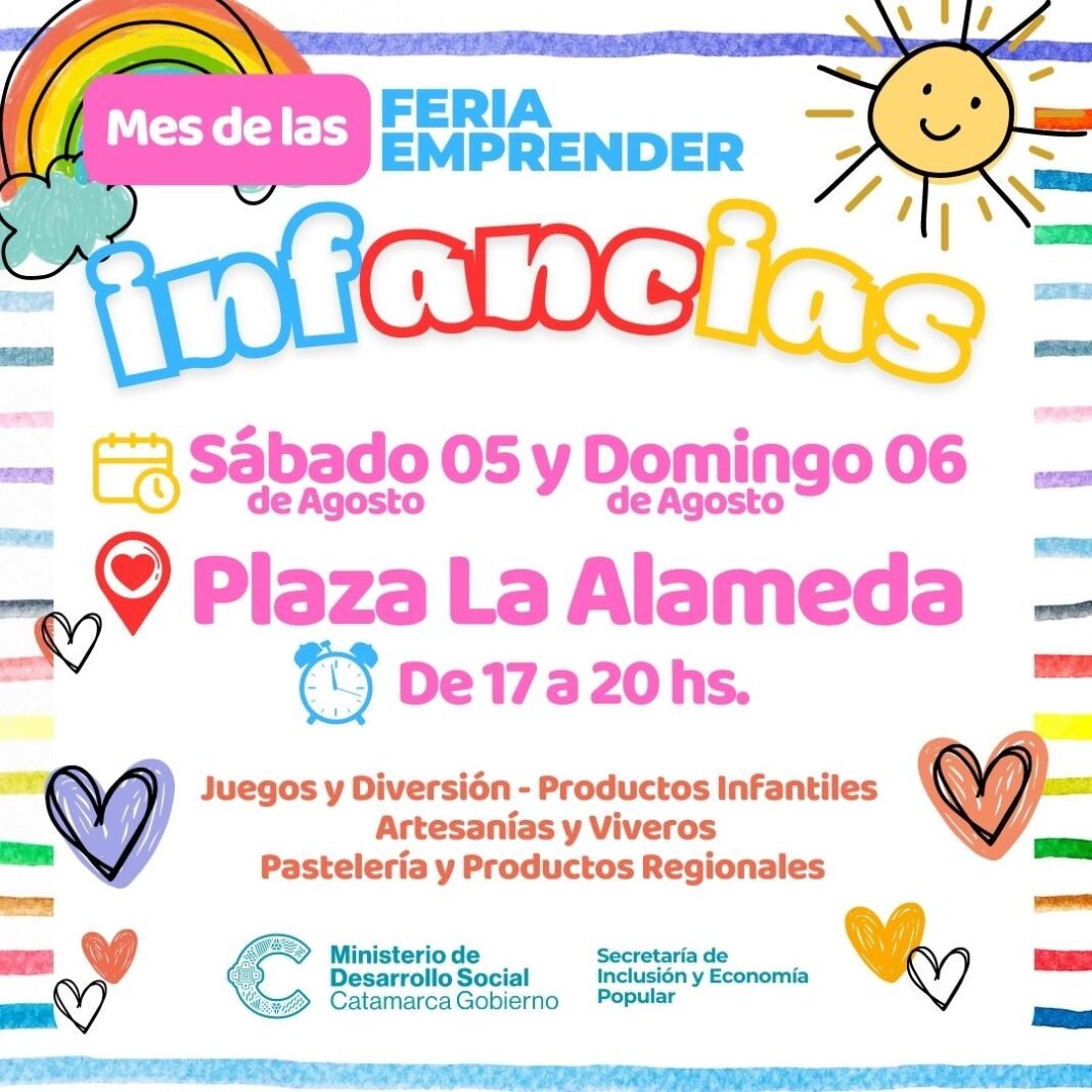 Desde el Ministerio de Desarrollo Social a través de la secretaria de Inclusión llevará a cabo la Feria Emprender que se realizará este sábado 5 y domingo 6 de agosto, tendrá lugar en la Plaza La Alameda de 17 a 20 horas con motivo de celebrar el mes de las infancias.
