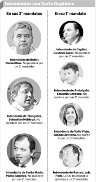 Además, hay otros tres intendentes que, si bien recién están en su primer mandato, la Carta Orgánica (CO) de sus jurisdicciones también les impiden las re-re. En este grupo están: Gustavo Saadi de Capital, Eduardo Córdoba de Andalgalá y Susana Zenteno de Valle Viejo.