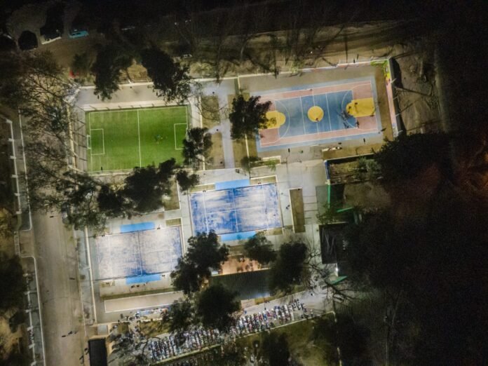 Además, el predio cuenta con una cancha de futbol 5 de césped sintético, cancha de tejo, playón multideportivo para la práctica de básquet, vóley, hándbol, futsal, newcom, patín, etc., bar, espacios verdes, baños, entre otros.