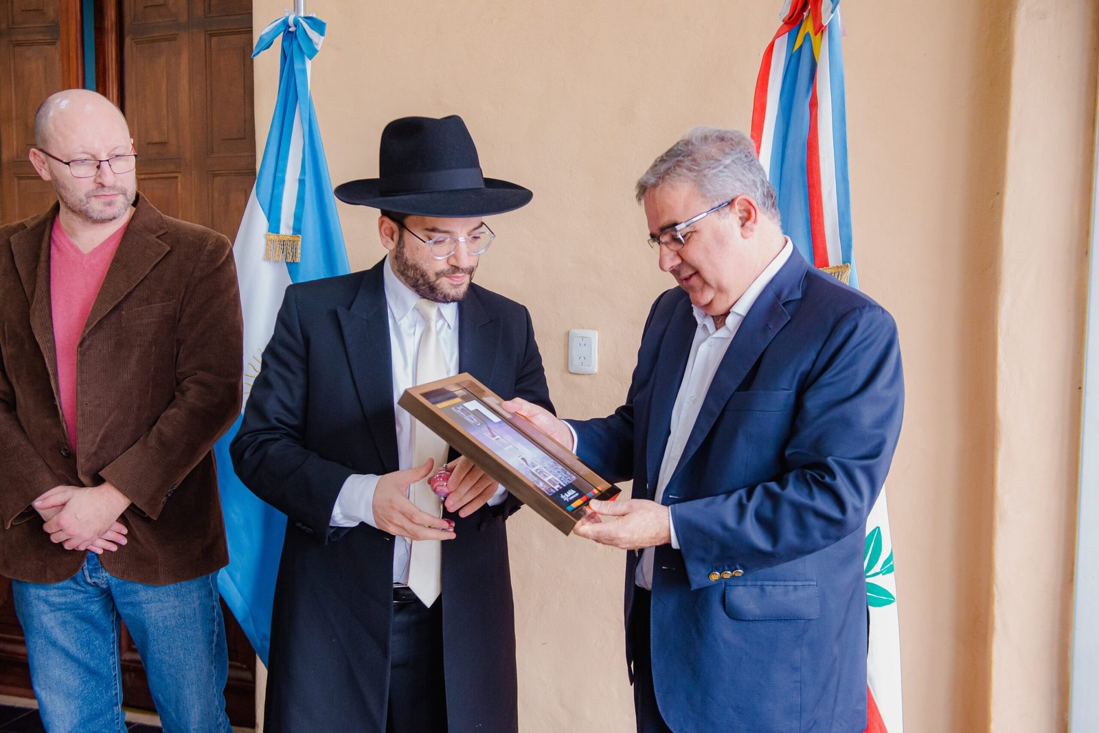 Al final del encuentro, el rabino Hamra obsequió al gobernador Raúl Jalil una fotografía de “El muro de la memoria”, que fue pintado por el artista Martín Ron en 2018.