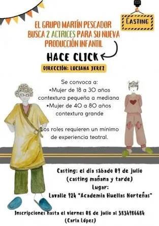El Grupo Martín Pescador convocó a un casting destinado a actrices catamarqueñas para la obra “Hace Click» de Luciana Jerez. Se seleccionarán dos interpretes que cubrirán los roles de acuerdo a los criterios que buscados por las directora.