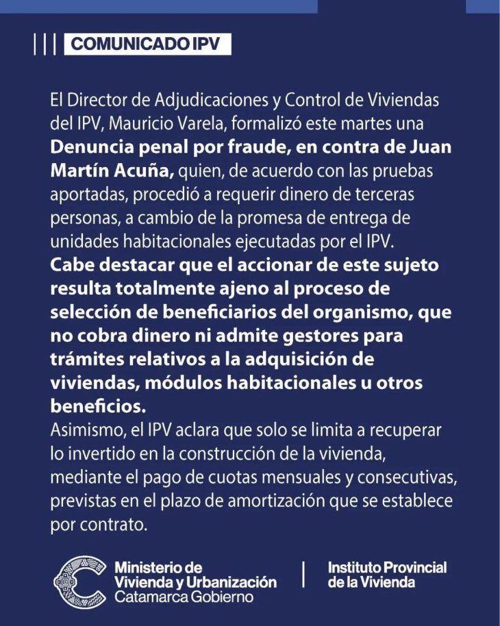 El Instituto Provincial de la Vivienda (IPV) formalizó este martes una denuncia penal por presunto fraude en contra de Juan Martín Acuña, quien, según se informó oficialmente, habría requerido dinero a terceros bajo la promesa de gestionar la entrega de viviendas ejecutadas por el organismo.