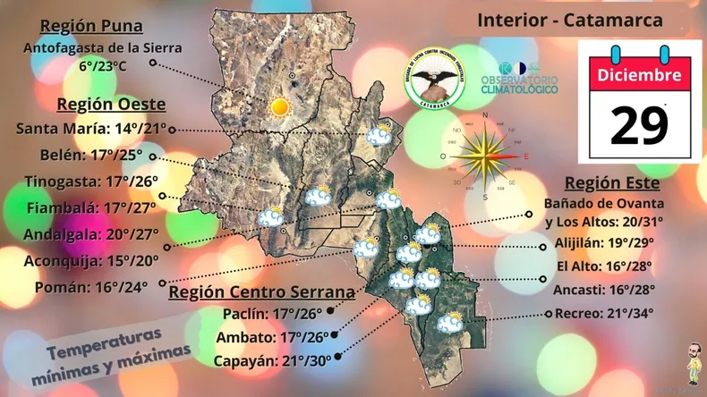 El pronóstico del tiempo elaborado y estudiado por los integrantes del Observatorio Climatológico de la Universidad Nacional de Catamarca, dice que hoy después de las precipitaciones que se dieron en gran parte de la provincia, quedó un cielo parcialmente nublado durante la primera parte del día a algo nublado por la tarde, la temperatura máxima desciende levemente y para hoy se esperan 32ºC de máxima y los vientos serán entre leves a moderados en direcciones variables.
