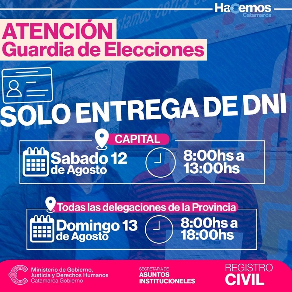 En este sentido, el funcionario resaltó: “Durante esta semana el horario de atención en la oficina central y delegaciones del interior es normal, es decir de 7.30 a 12 en toda la provincia y de 14.30 a 19.30 en la oficina central de calle República 1052. Pero, durante el sábado 12 y domingo 13 vamos a trabajar con el sistema de “Guardia de elecciones” solo para entrega de DNI”, afirmó Herrera tras resaltar que “en capital se podrán retirar los DNI el sábado 12 de 8 a 13 horas y el domingo en horario corrido de 8 a 18 horas mientras que en el interior de la provincia, en todas nuestras delegaciones, la atención se realizará solo el dia domingo 13 en el horario de 8 a 18 horas”, aseguró.