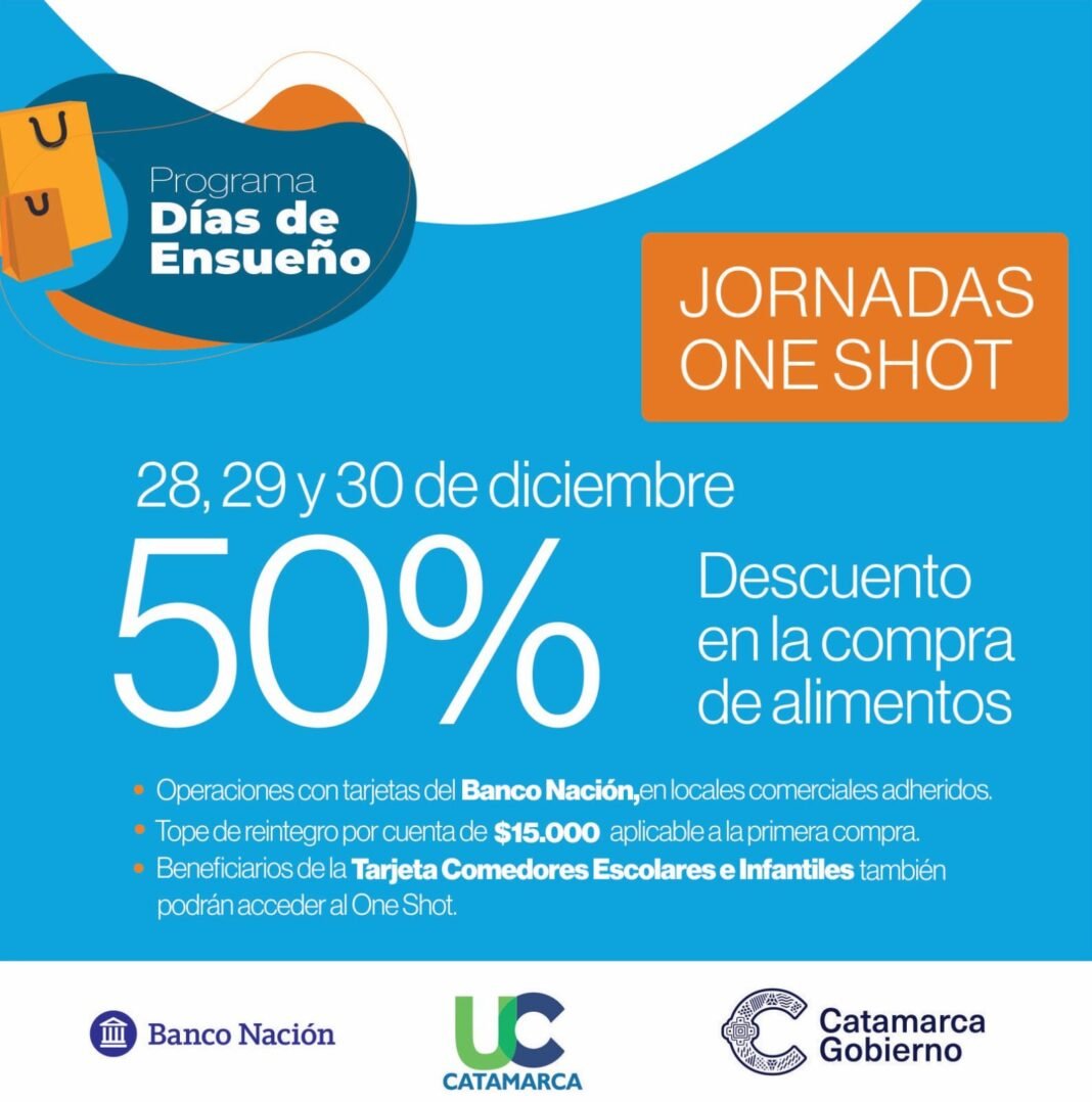 El Ministerio de Economía anuncia que las Jornadas One Shot Alimentos que se articulan con el Banco Nación Argentina y la Unión Comercial de Catamarca se realizarán los días 28, 29 y 30 de diciembre, en las mismas condiciones en que se vienen llevando a cabo hasta aquí.