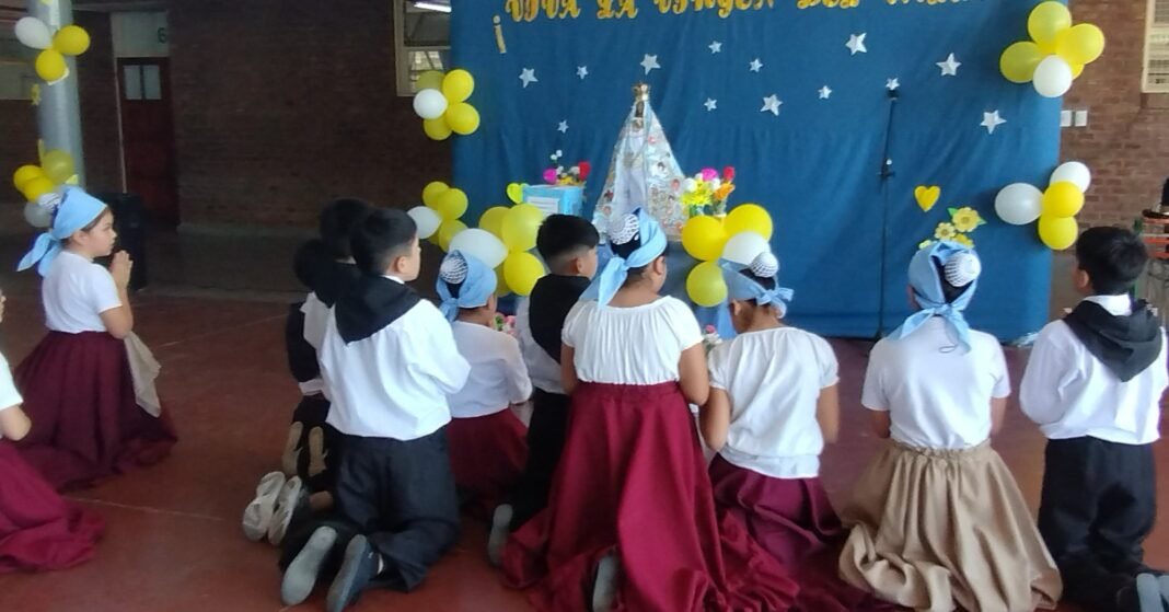 Seguidamente, se ofreció un homenaje cultural, que estuvo a cargo del cantante Alberto Harón y de niños de 4° grado, quienes danzaron enfrente de la imagen peregrina de la Madre del Valle, que permanecerá en la institución educativa hasta las 17.30.