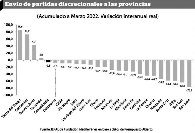 Un informe del IERAL de la Fundación Mediterránea advierte de la caída de las transferencias discrecionales a la provincia de Catamarca durante el primer trimestre del año. En total, fue del 7,3% y fue la más baja de todas las provincias que sufrieron un merma en estos envíos que están por fuera de la coparticipación.