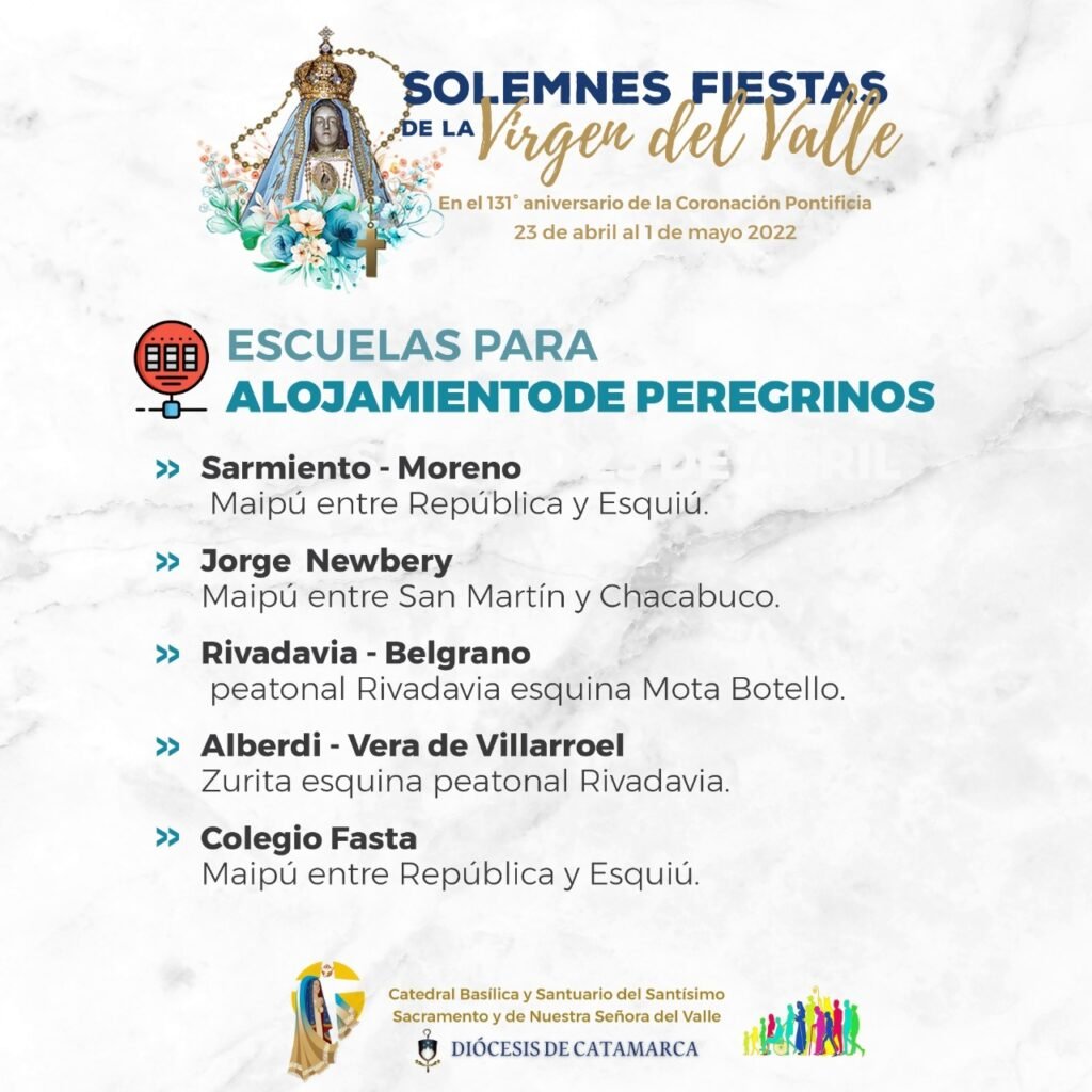 Las escuelas que estarán destinadas al hospedaje de los peregrinos que llegan a honrar a Nuestra Madre del Valle son:
