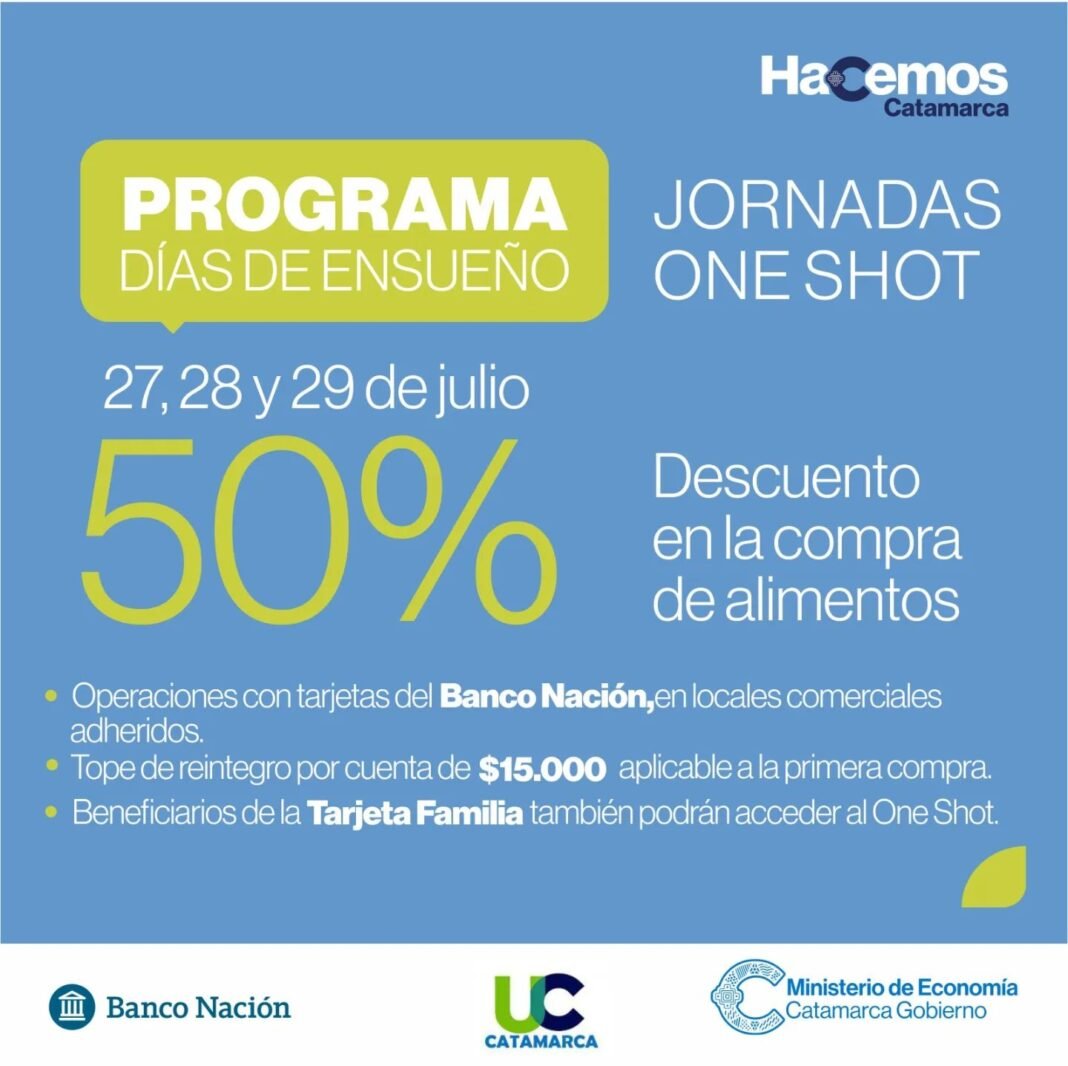 El Ministerio de Economía informa que los días jueves 27, viernes 28 y sábado 29 de julio los consumidores catamarqueños que disponen de tarjetas de crédito del Banco Nación podrán aprovechar los beneficios de las jornadas One Shot Alimentos, programa que implementa el Gobierno de Catamarca con el citado banco y la Unión Comercial de Catamarca.