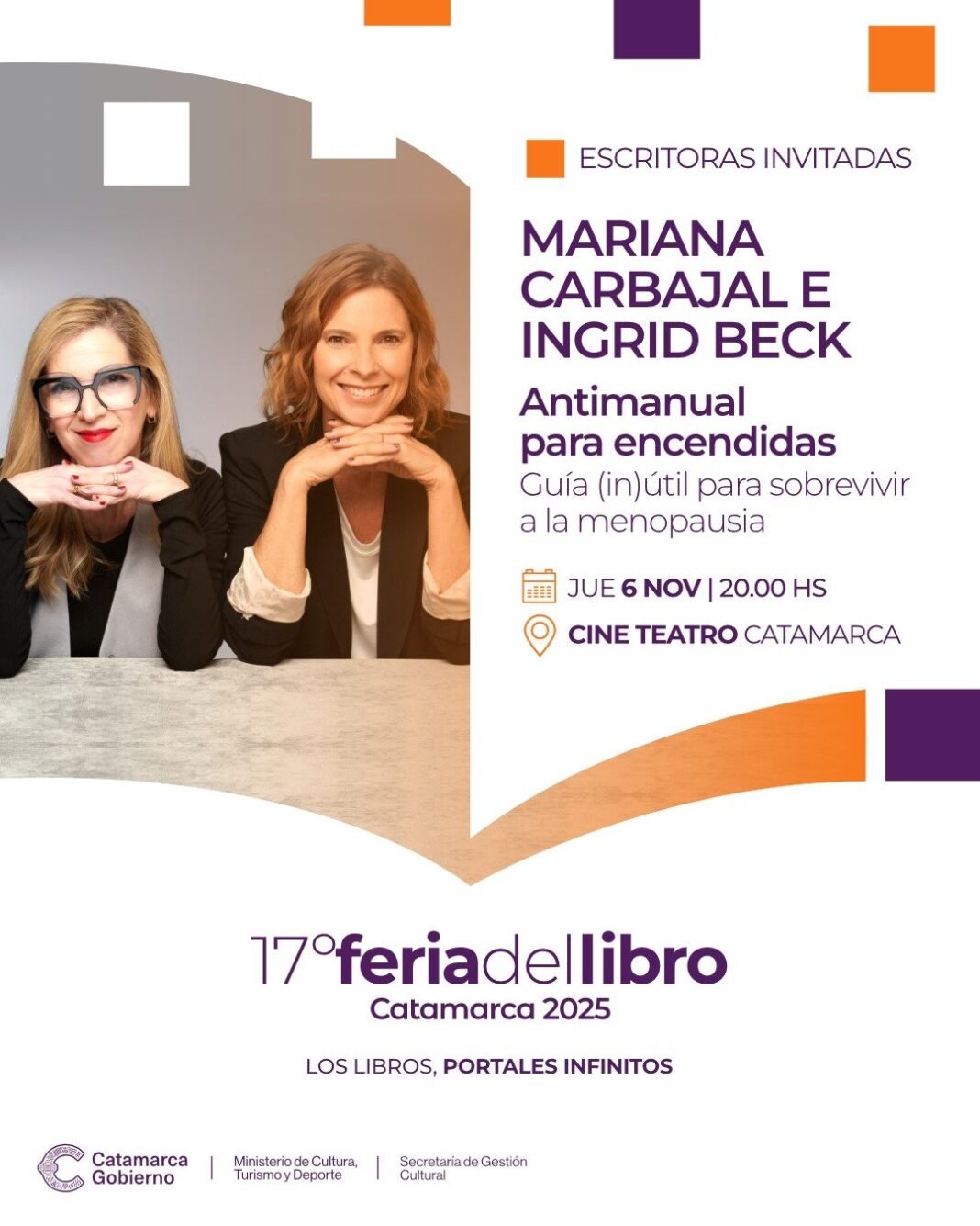 En el marco de la 17° Feria del Libro de Catamarca, las periodistas y escritoras Mariana Carbajal e Ingrid Beck presentarán su nuevo libro “Antimanual para encendidas. Una guía (in)útil para sobrevivir a la menopausia” (Grijalbo, Penguin Random House). El encuentro se realizará el jueves 6 de noviembre a las 20 horas, en el Cine Teatro Catamarca
