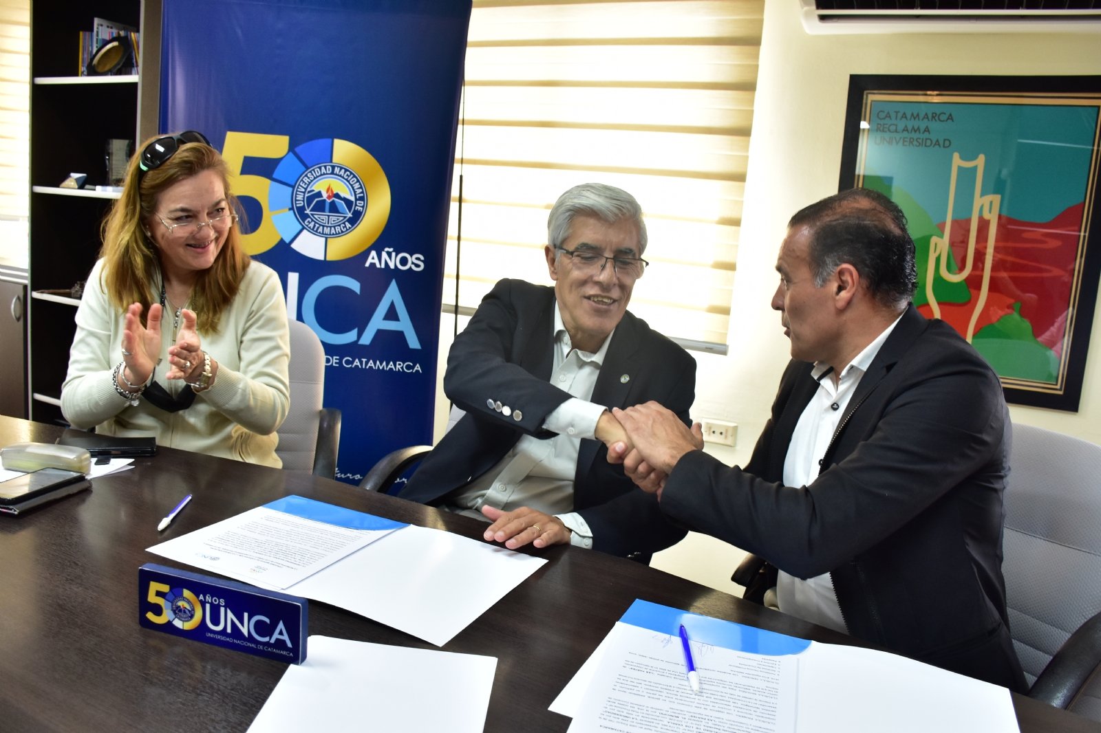 El rector de la UNCA, Ing. Oscar Alfonso Arellano y Orlando Marcelo Saavedra, intendente de Los Varela, departamento Ambato, rubricaron el documento en un acto que se desarrolló en el Rectorado de la Universidad Nacional de Catamarca.