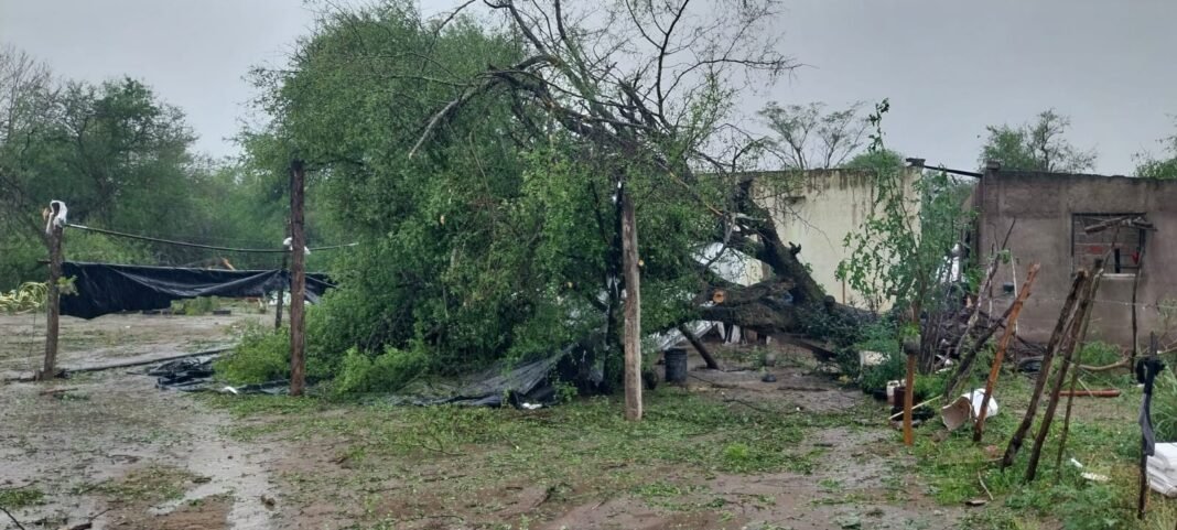 Consecuencias del evento adverso Meteorológico: Más de 60 postes de energía eléctrica caídos, los sitios mencionados se encuentran sin servicio de electricidad. También se observó en relevamiento voladuras de techos de chapa, casillas de chapa y madera etc. En menor medida árboles caídos.