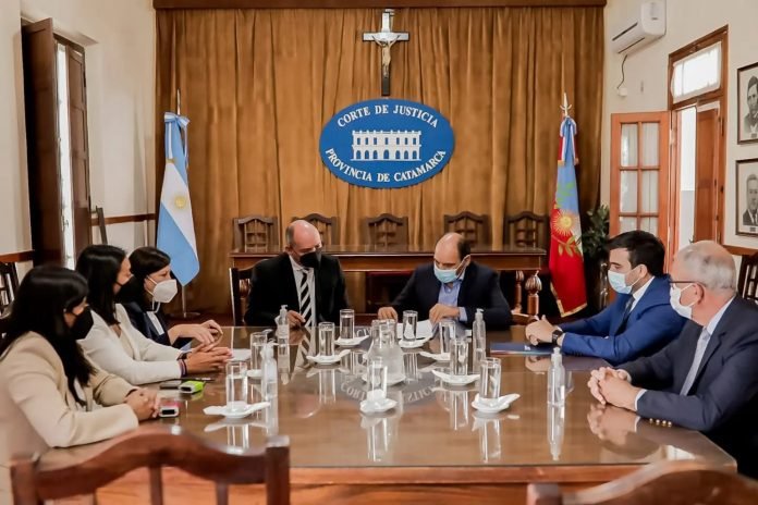 El intendente de la Capital, Gustavo Saadi, acompañado por el secretario de Gabinete y Modernización, Mariano Rosales; firmó importantes acuerdos con la Corte de Justicia, al cabo de una reunión de la que participaron el presidente de la Corte, Carlos Figueroa Vicario, y los ministros Vilma Molina, José Cáceres, Fabiana Gómez, Luis Cippitelli, Hernán Martel y Fernanda Rosales.