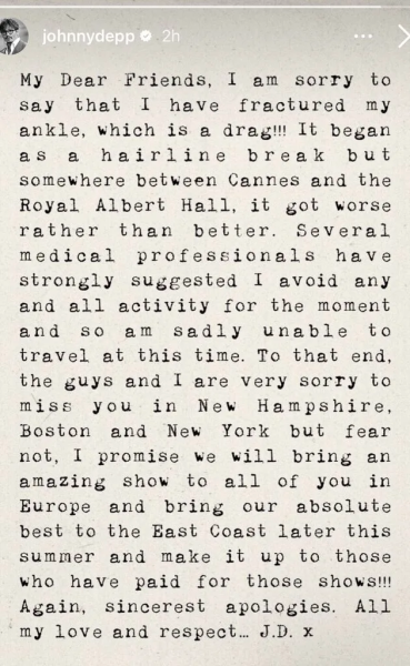 Depp escribió en Instagram: “Mis queridos amigos, siento decirles que me fracturé el tobillo, ¡¡¡que fastidio!!!” Empezó como una lesión pequeña, pero en algún lugar entre Cannes y el Royal Albert Hall, empeoró en lugar de mejorar. Varios profesionales médicos me han sugerido encarecidamente que evite toda actividad por el momento, por lo que lamentablemente no podré viajar”.