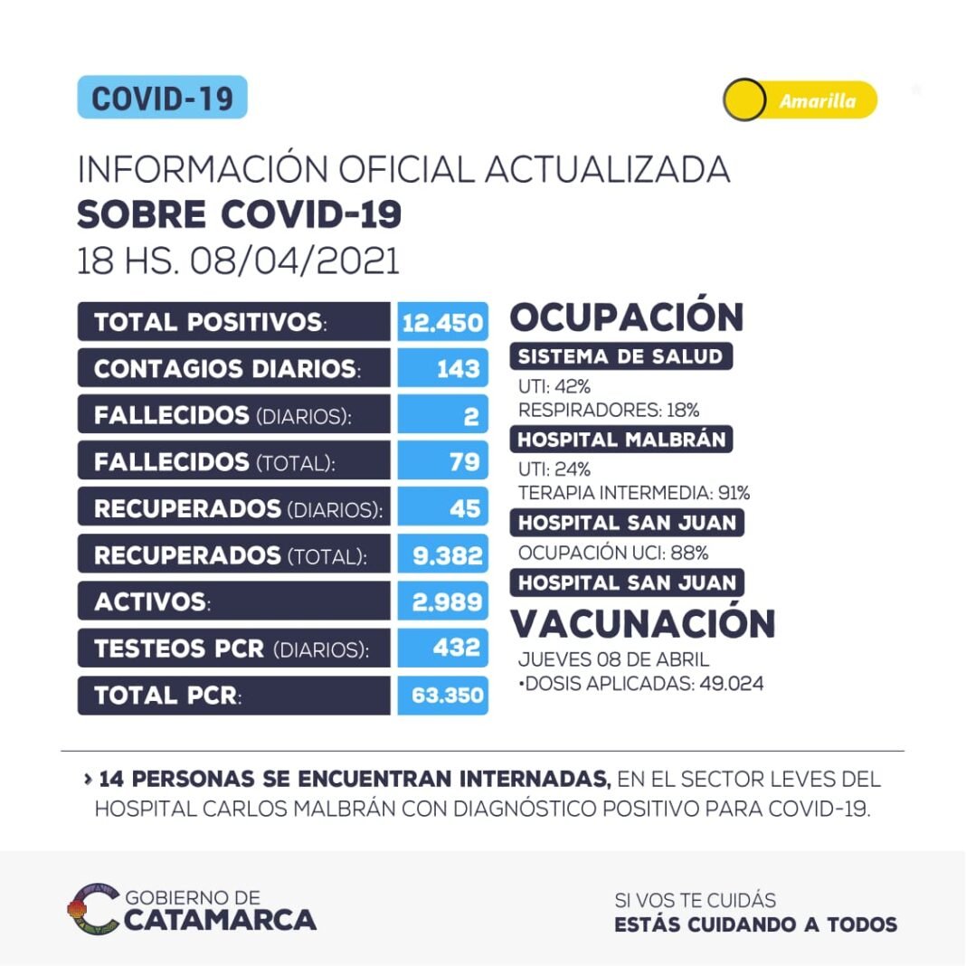 Hasta las 18 horas del jueves 8 de abril, se han detectado 143 nuevos casos positivos de coronavirus en la provincia de Catamarca. El total acumulado de casos positivos detectados asciende a 12.450.