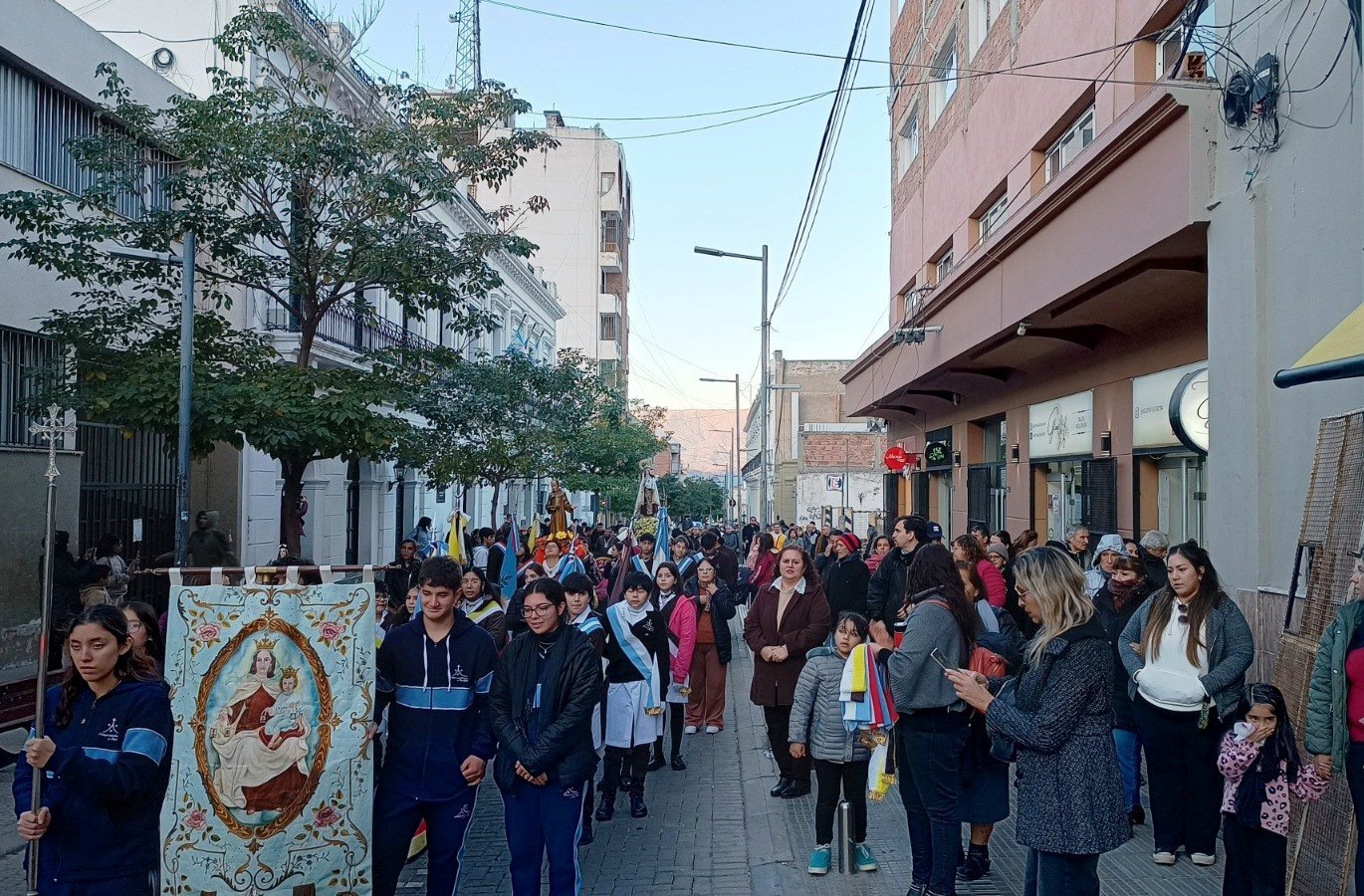 La sagrada imagen salió del templo ubicado en la intersección de calles Junín y San Martín, siendo recibida con pañuelos blancos al aire, vivas y repique de campanas; allí mismo recibió su primer homenaje, que estuvo a cargo de los bailarines Pilar Pacheco y Sebastián Isasmendi, este último alumno del Colegio.