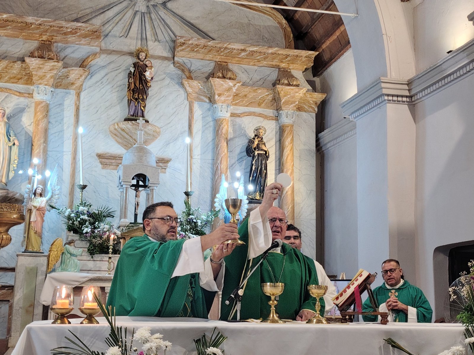 La Santa Misa fue presidida por el obispo diocesano, Mons. Luis Urbanč y concelebrada por los párrocos entrante y saliente, padres Marcelo Amaya y Carlos Robledo, respectivamente; los sacerdotes Diego Manzaraz, canciller y secretario general de la Curia Diocesana; Lucas Segura, vicario para la Educación; Víctor Vizcarra, Rogelio Suárez, Eugenio Pachado, Martín Melo y Eduardo Navarro, párrocos del Espíritu Santo (Capital), Nuestra Señora del Rosario (Paclín), Jesús Niño (Capital), Nuestra Señora de Belén (Belén) y Santa Ana y San Joaquín (Miraflores), respectivamente.