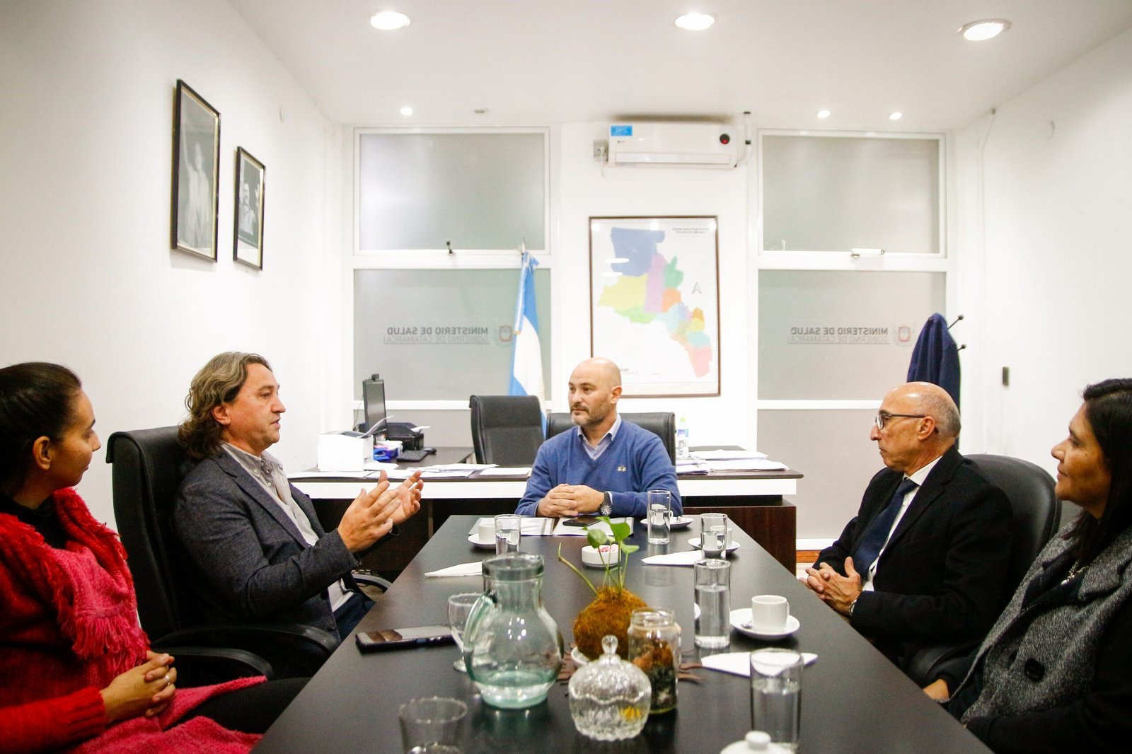 Para la firma del convenio, el ministro de Salud, Lucas Zampieri, recibió al director de la Carrera de Medicina de la Escuela Superior de Medicina de Mar del Plata, Dr. Adrián Alasino, junto a la secretaria de Asistencia en Salud Pública, Johana Carrizo, la secretaria de Planificación y Gestión en Salud, Daniela Ayala, y al decano de la Facultad de Ciencias de la Salud de la UNCa, Omar Barrionuevo.