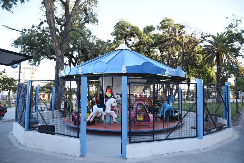 En la renovada plaza 25 de Agosto, esta la tradicional calesita, este carrusel que parece no tener paso del tiempo, hoy luce renovada y los chicos sigue disfrutando como lo hacían quizás sus padres, ya que la calesita cumplió 42 años de permanencia. Bruno Fillipin, hoy su propietario, dijo que se trata de un negocio familiar y fue su suegro quien coloca la calesita hace 42 años atrás.