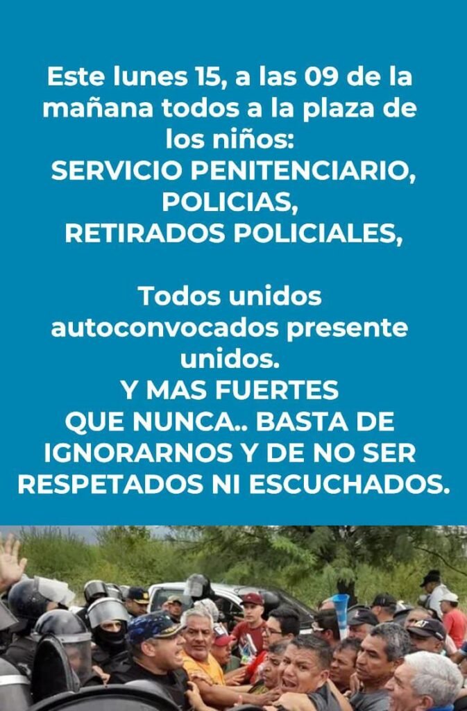 Una vez agotada las instancias de dialogo que habia propuesto la Ministra de Seguridad, Fabiola Segura y el Jefe Policial, Cordoba; la familia policial vuelve a las calles a manifestarse, esta vez será este lunes 15 de abril a las 09 hs lugar de concentarción que decidieron fue Parque de los Niños y de ahi partiran a Casa de Gobierno, la convocatoria la hace la mesa de dialogo tras el fracaso y el insistir en reuniones para avanzar con las negociaciones salariales.