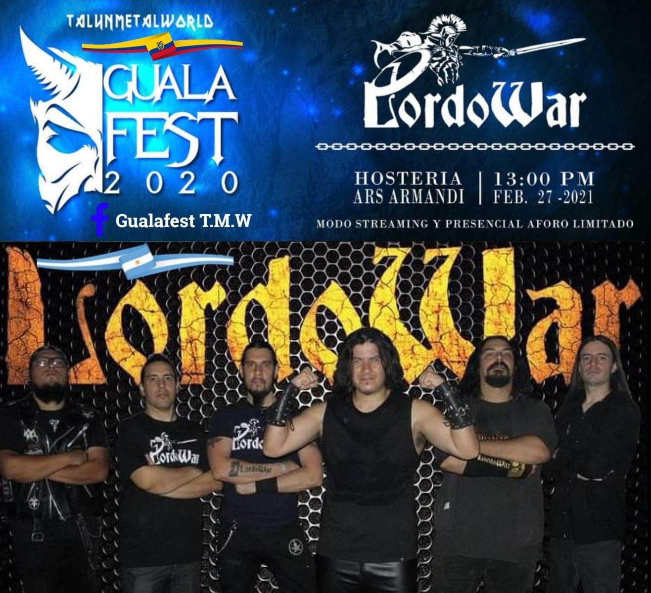 Lordowar ( Epic Power Metal ) de La Provincia de Catamarca, Será una de las Bandas ARGENTINAS, en Participar Del GUALA Fest 2021 ( VI Edición ). Uno de los Festivales Mas Importantes de ECUADOR, está Vez En Modalidad Streaming y Presencial ( Aforo Limitado ) Organizado Por el Productor Gualaceño y Gestor Cultural, Cristian Guaraca. El Festival Guala de Ecuador, Se Realizará el Sabado 27 de Febrero En Muelle de Hosteria Ars Amandi a las 15 Hs de Arg. y sera Transmitido por ( Facebook Live ) a través de la Pagina de GualaFest T.M.W.