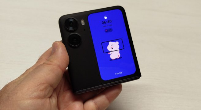 El diseño trasero del OPPO Find N2 Flip, definido por la pantalla para notificaciones