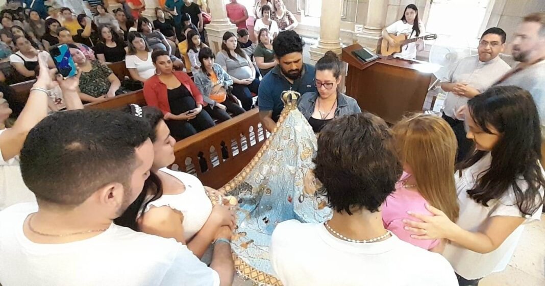 El sacerdote compartió una reflexión y luego se realizó la imposición del manto de la Virgen del Valle en el vientre de las embarazadas.