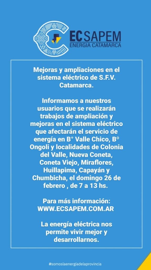 Informamos a nuestros usuarios que se realizarán trabajos de ampliación y mejoras en el sistema eléctrico que afectarán el servicio de energía en B° Valle Chico, Bº Ongoli y localidades de Colonia del Valle, Nueva Coneta, Coneta Viejo, Miraflores, Huillapima, Capayán y Chumbicha, el domingo 26 de febrero , de 7 a 13 hs.