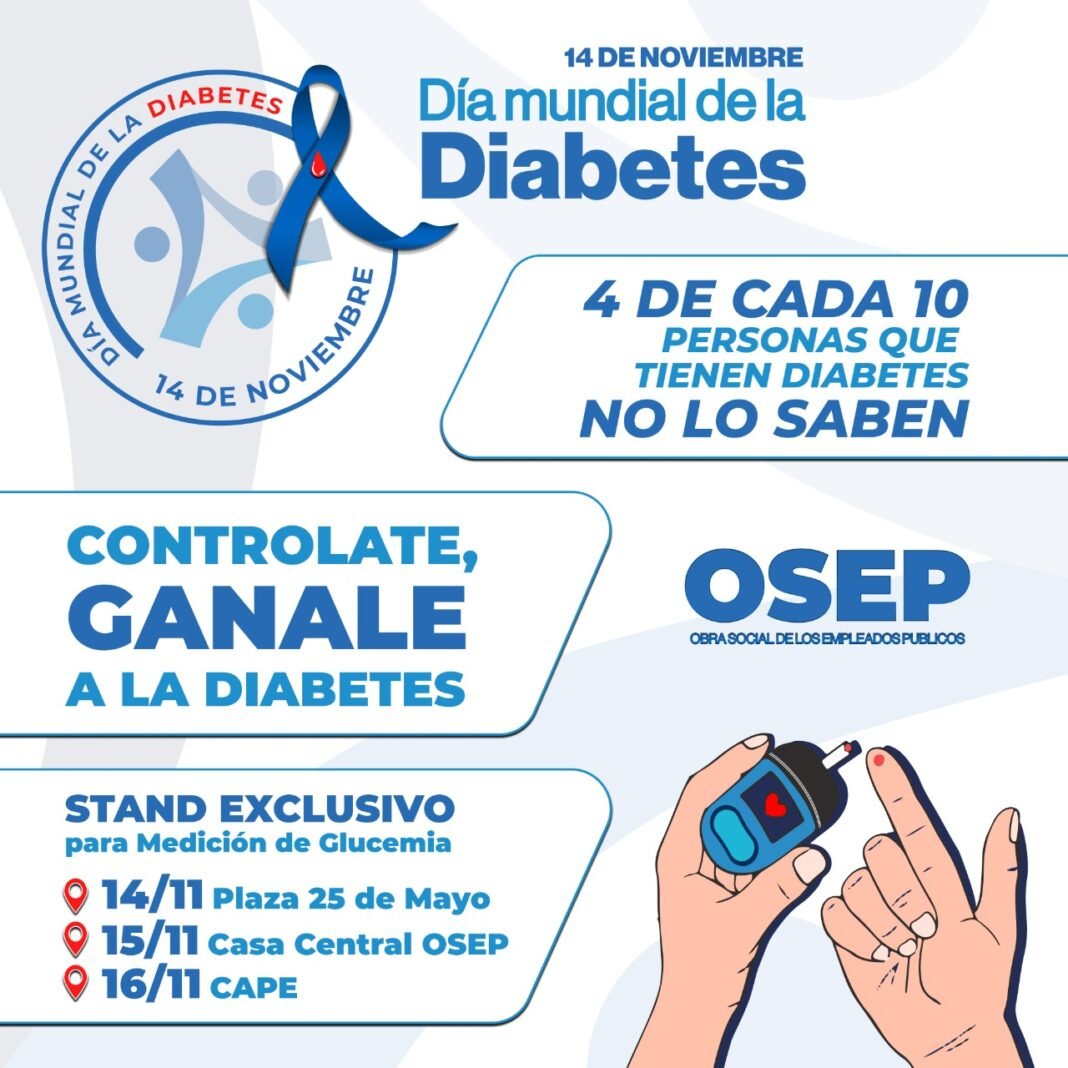 La Obra Social de los Empleados Públicos (OSEP) dará inicio este lunes 14 de noviembre -fecha en que se celebra el Día Internacional de la Diabetes- a una serie de acciones destinadas a la detección y prevención de la patología. Las actividades tendrán lugar en su Casa Central, en la plaza 25 de Mayo y en el CAPE.