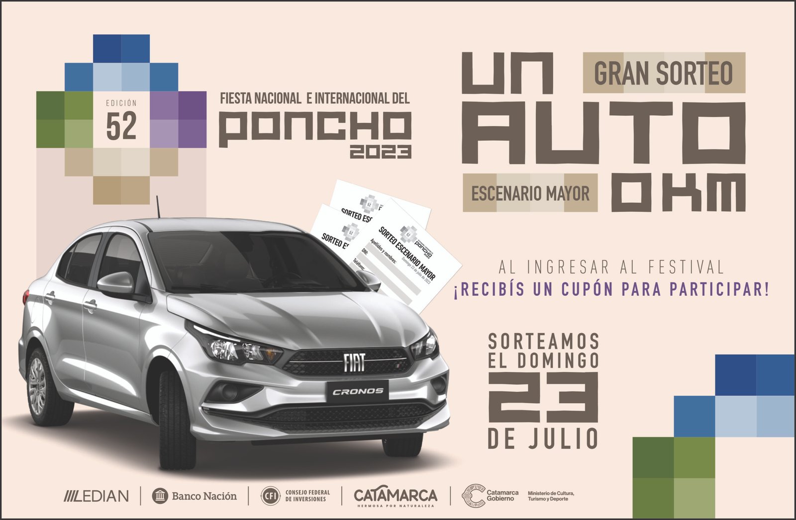 El público que asista a los espectáculos del Escenario Mayor de la 52° Fiesta Nacional e Internacional del Poncho, que se lleven a cabo entre el 15 y el 23 de julio en el Predio Ferial Catamarca, tendrá la posibilidad de participar por el sorteo de un auto cero kilómetro Fiat Cronos, de Ledian Automotores, entre otros premios.