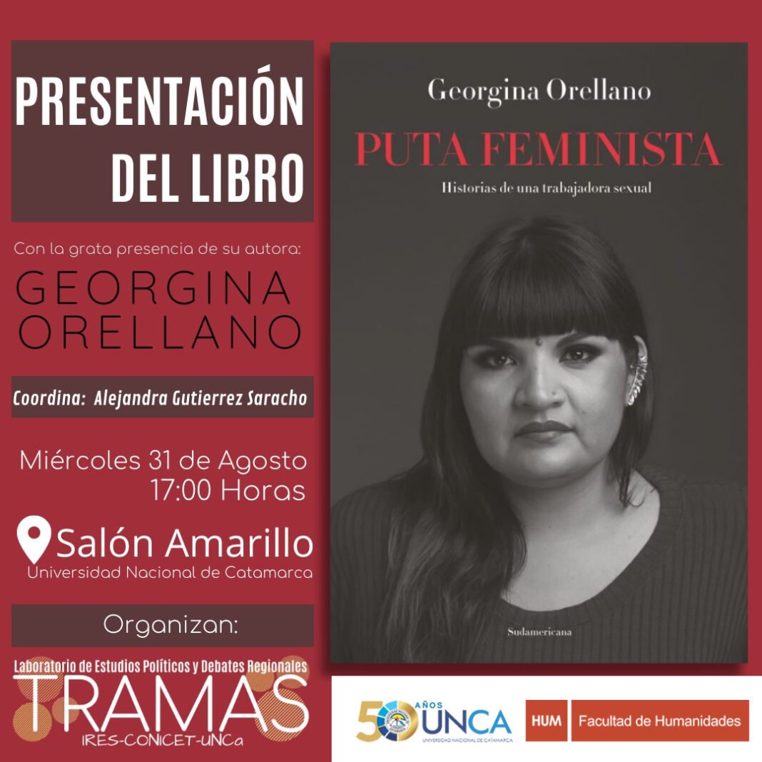El día miércoles 31 de agosto a las 17 hs en el Salón Amarillo de la Facultad de Humanidades de la UNCa, se realizará la presentación del libro “Puta Feminista. Historia de una Trabajadora Sexual”, de la autora Georgina Orellano, secretaria general de la Asociación de Mujeres Meretrices de Argentina. La actividad es organizada por el Laboratorio de Estudios Políticos y Debates Regionales TRAMAS – IRES-CONICET – UNCA y la Secretaria de Investigación y Postgrado de la Facultad de Humanidades.