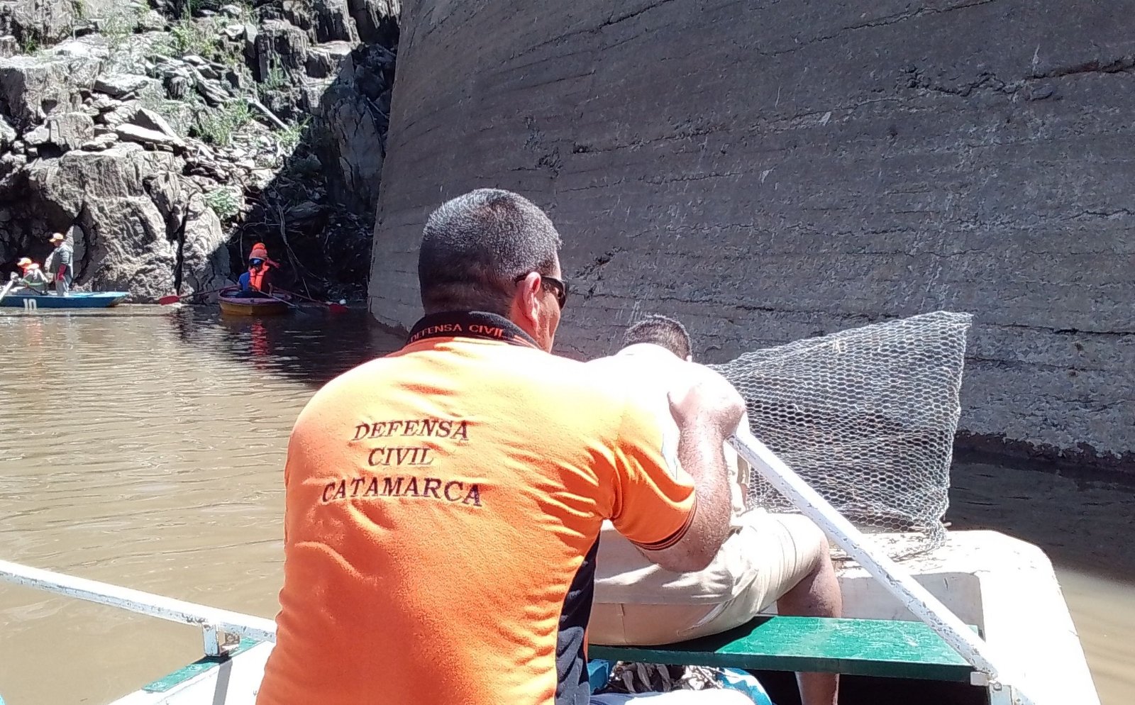 Personal de Defensa Civil perteneciente a Los Altos Municipio y de la provincia llevaron a cabo la recolección y limpieza ante la masiva aparición de peces muertos, en el dique La Cañada.