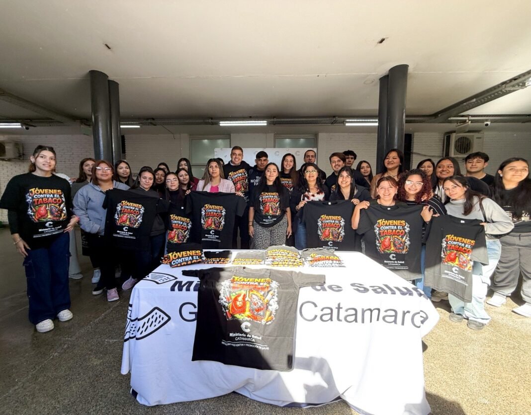 La ministra de Salud de la provincia, Dra. Johana Carrizo, hizo entrega de remeras al grupo Aire Jóven, quienes realizarán prevención de consumo de tabaco en el marco de la Presentación de Buzo 2026.