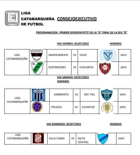 Se aprobó la programación del petit torneo de ambas categorías en la liga catamarqueña para los días viernes, sábado y domingo en el siguiente orden.
