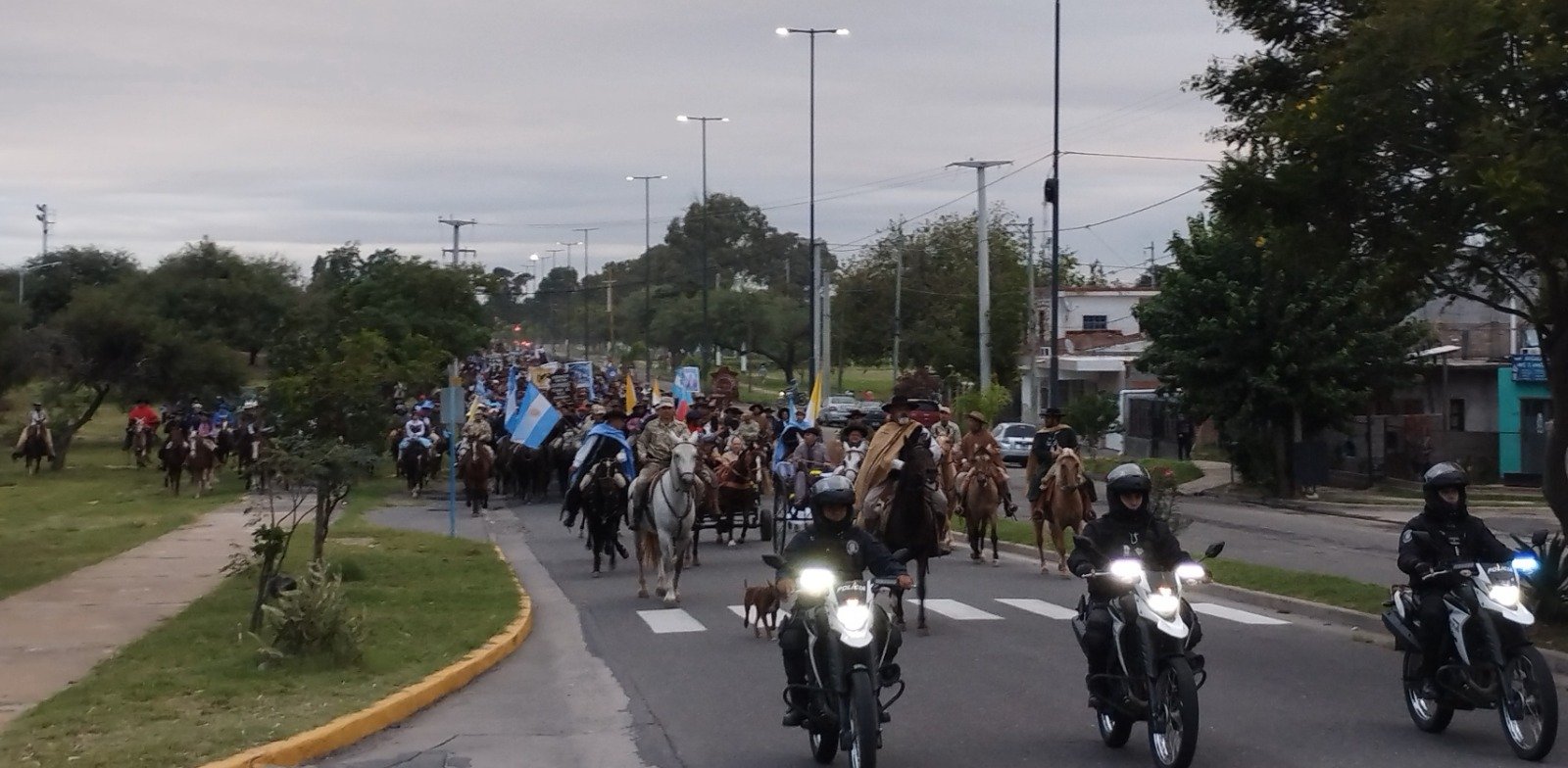 Una interminable columna de varones y mujeres a caballo, llegados desde distintas comunidades del interior catamarqueño y provincias vecinas, pobló el sector Este de la ciudad capital brindando una postal diferente. Montados a caballo, con sus estandartes, banderas argentinas, papales y provinciales pusieron color y alegría a la mañana dominical. Precedía la cabalgata el obispo diocesano, Mons. Luis Urbanč, llevando la Imagen peregrina, escoltada por la Policía Montada, acompañado por Mons. Darío Quintana, obispo de Cafayate. Los vecinos ubicados a la vera del camino saludaban su paso sumándose así a esta manifestación de fe mariana.