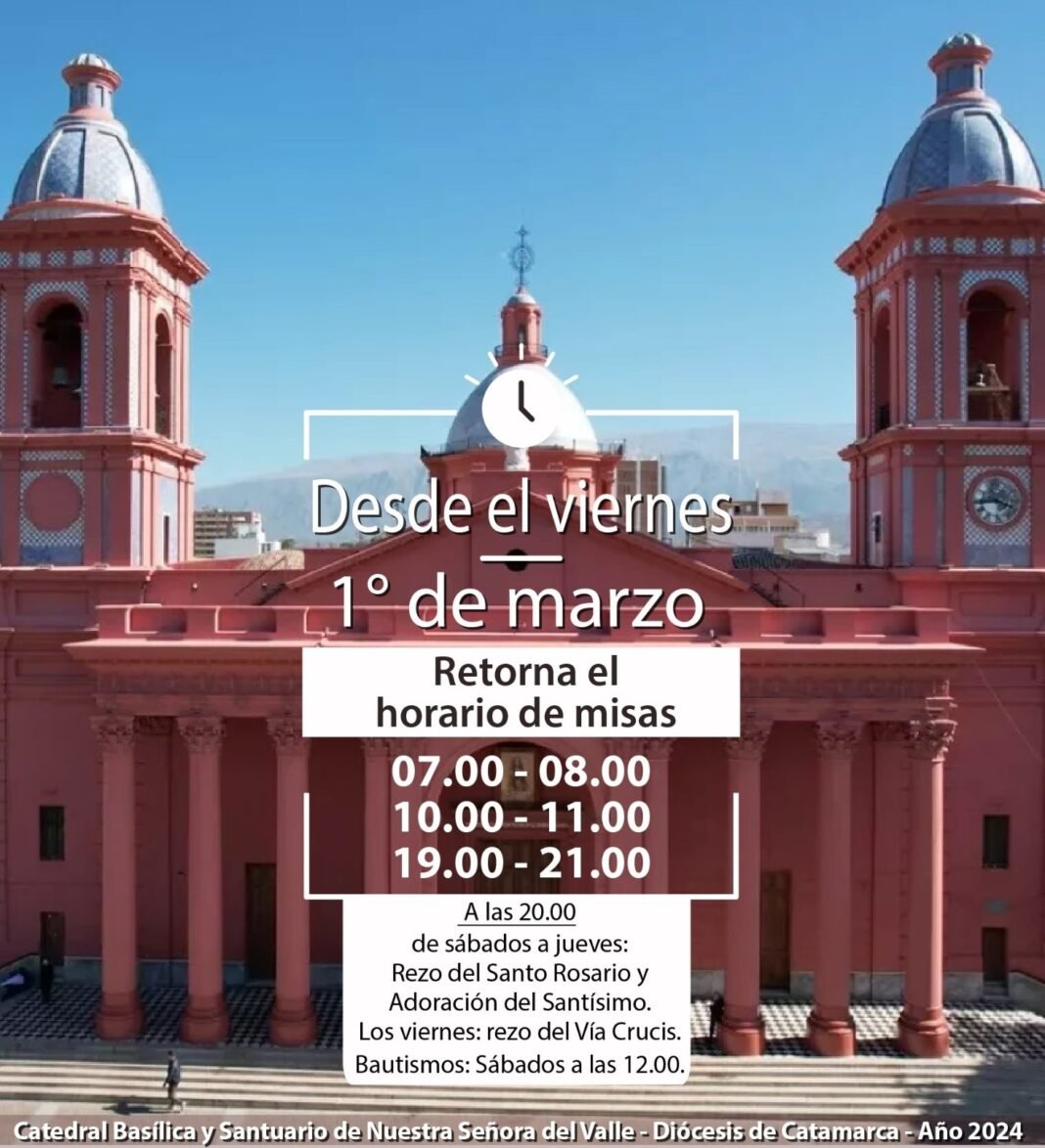 Desde la Catedral Basílica y Santuario de Nuestra Señora del Valle, comunican que, a partir del viernes 1 de marzo, se retoma el horario habitual de Misas diarias.