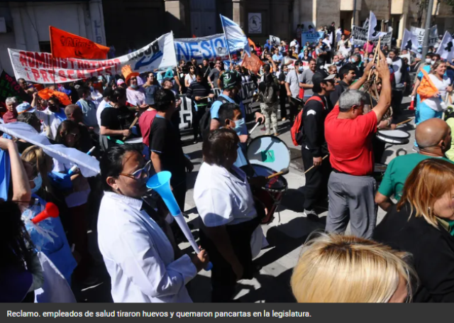 El conflicto salarial con el sector de la Salud sigue en ascenso y ahora involucró a la Legislatura provincial. Sucede que los trabajadores Autoconvocados y de APROSCA, se expresaron en contra de los diputados del oficialismo a los que juzgaron por “hacer un circo” luego de la sesión del miércoles donde, entre otras cosas, dieron media sanción para crear una comisión bicameral que tendrá como fin modificar la ley de carrera sanitaria. Pero además de los planteos, los trabajadores se movilizaron como todos los jueves y en esta oportunidad marcharon hacia el Poder Legislativo, donde arrojaron huevos al edificio.