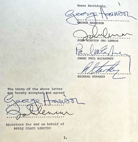 El lote es un documento mecanografiado de dos páginas firmado por “Paul McCartney” y “R. Starkey”, dos veces firmado por “George Harrison” y “John Lennon”; Apple Corps Limited, fechado el 29 de diciembre de 1974.