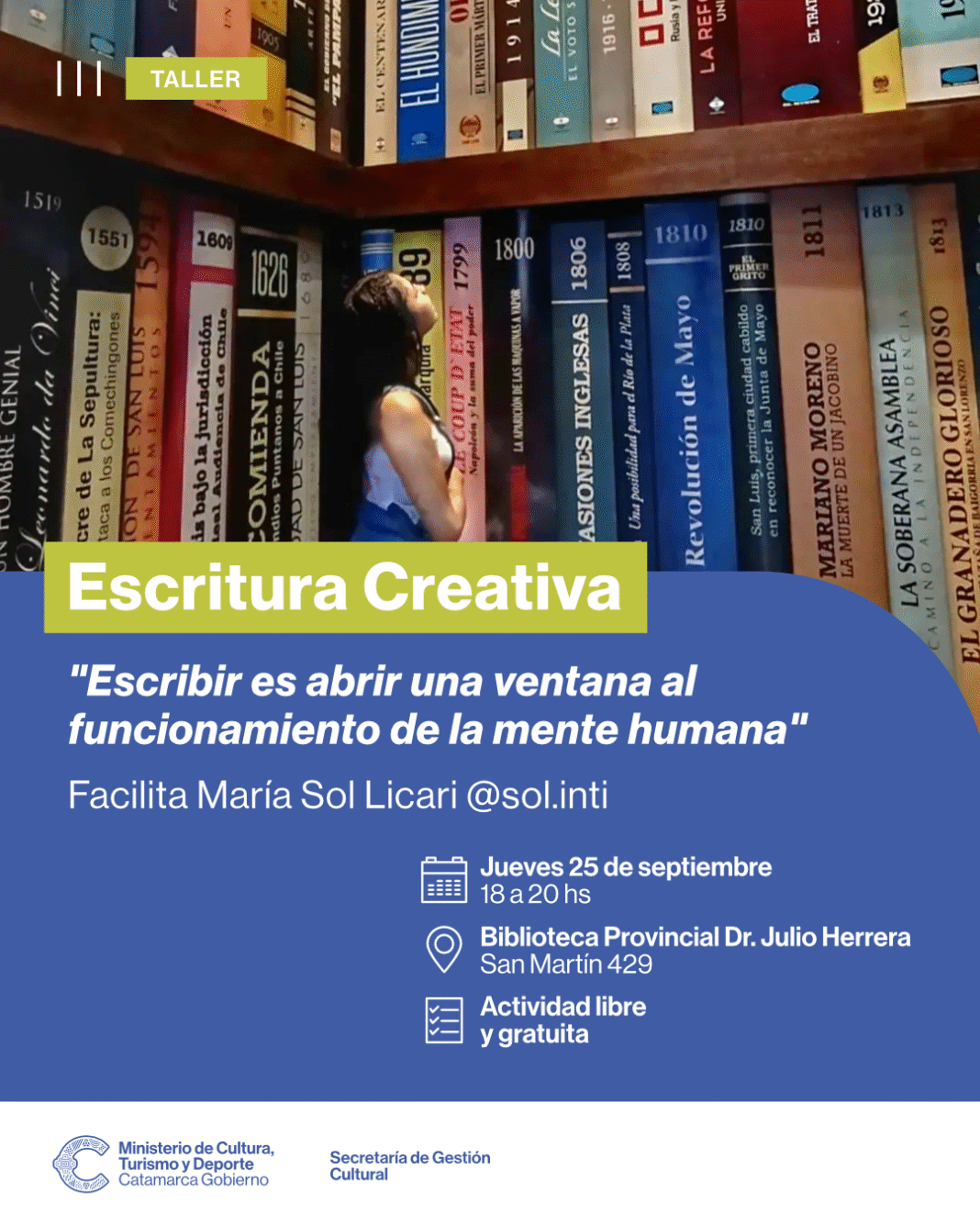 “Escribir es abrir una ventana al funcionamiento de la mente humana”, señala María Sol Licari, quien coordinará la actividad. Además de impartir talleres, Sol comparte su experiencia en divulgación de neurociencias del lenguaje en @neurolinguisticamente.